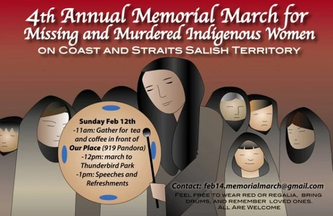 The 4th Annual Memorial March for Missing and Murdered Indigenous Women will be held on Sunday, February 12th, 2012, we will gather at 11:00 outside Our Place at 919 Pandora Ave. At noon we will march down Pandora to Government and on to Thunderbird Park. People are invited to gather at Thunderbird Park around 1pm for an open memorial event with speeches, songs, food, and prayers. This is a family event and people of all ages are welcome. There will be vans to support Elders or those requiring assistance along the march as well as bus tickets.