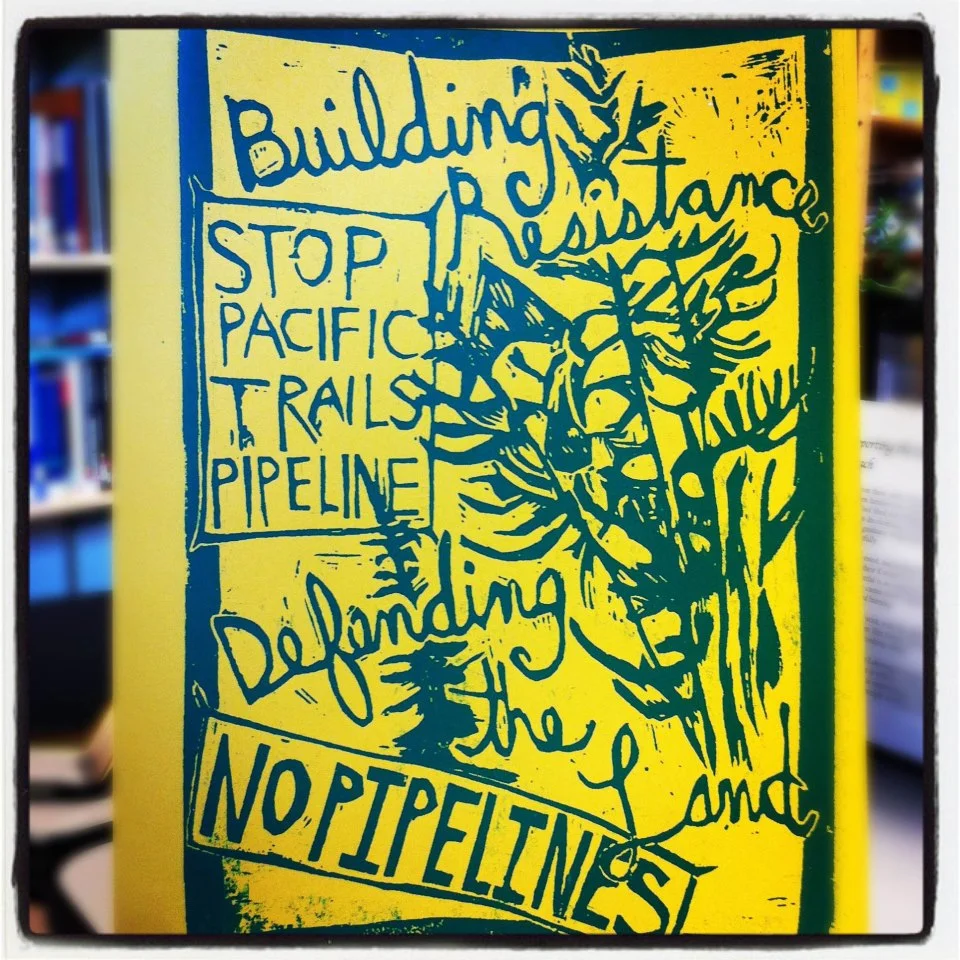 Annie and Ruby of the Co!nspire Collective have made a beautiful screen printed poster in support of the Unis’tot’en Clan of the Wet’suwet’en First Nation who are taking a strong stand against pipeline development on their territories. The Unis’tot’en have set up a permanent community on the lands targeted by pipeline companies.